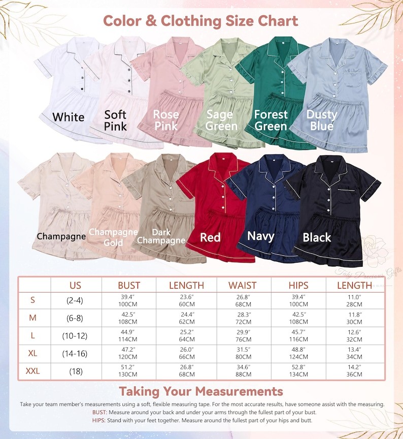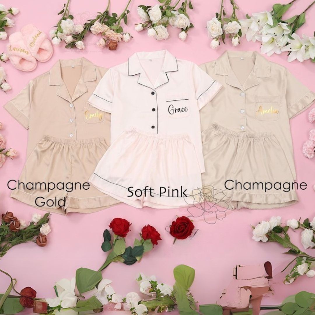 Dieses personalisierte Brautjungfern-Pyjama-Set ist aus hochwertigem Satin gefertigt, der sich zart und weich wie Seide anfühlt. Es sorgt für ein hautfreundliches Tragegefühl ohne Irritationen oder Juckreiz und ist somit perfekt für den Alltag. Das Design ist detailverliebt und besteht aus einem kurzärmligen Button-Down-Oberteil und Shorts ohne Kordelzug, die sowohl Komfort als auch Stil für Erwachsene bieten. Dieses Set ist ein ideales Geschenk für verschiedene Anlässe, darunter Brautpartys, Junggesellinnenabschiede, Geburtstage, Feiertage, Spa-Retreats, Pyjama-Partys und Flitterwochen. Verwöhnen Sie sich oder Ihre Brautjungfern mit diesem exquisiten Ensemble, das garantiert jede Entspannung oder Feier verschönert.