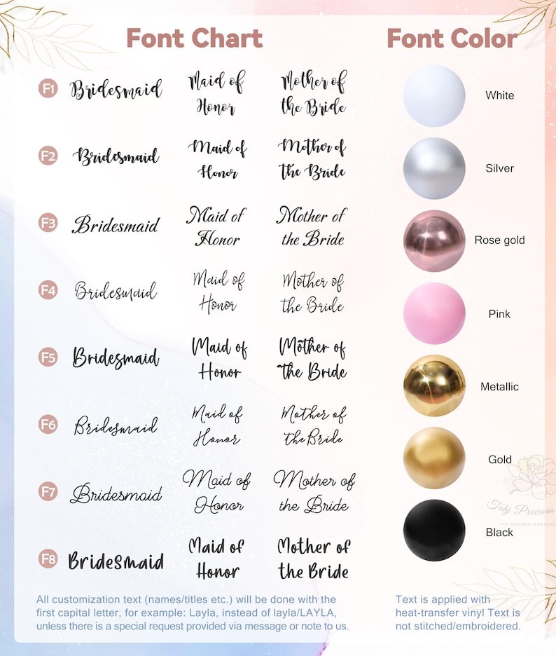 Alle Anpassungstexte (NAMEN/TITEL usw.) werden mit dem ersten Großbuchstaben ausgeführt, z. B.: Layla statt layla/LAYLA, es sei denn, es liegt ein Sonderwunsch per Nachricht oder Notiz an uns vor.